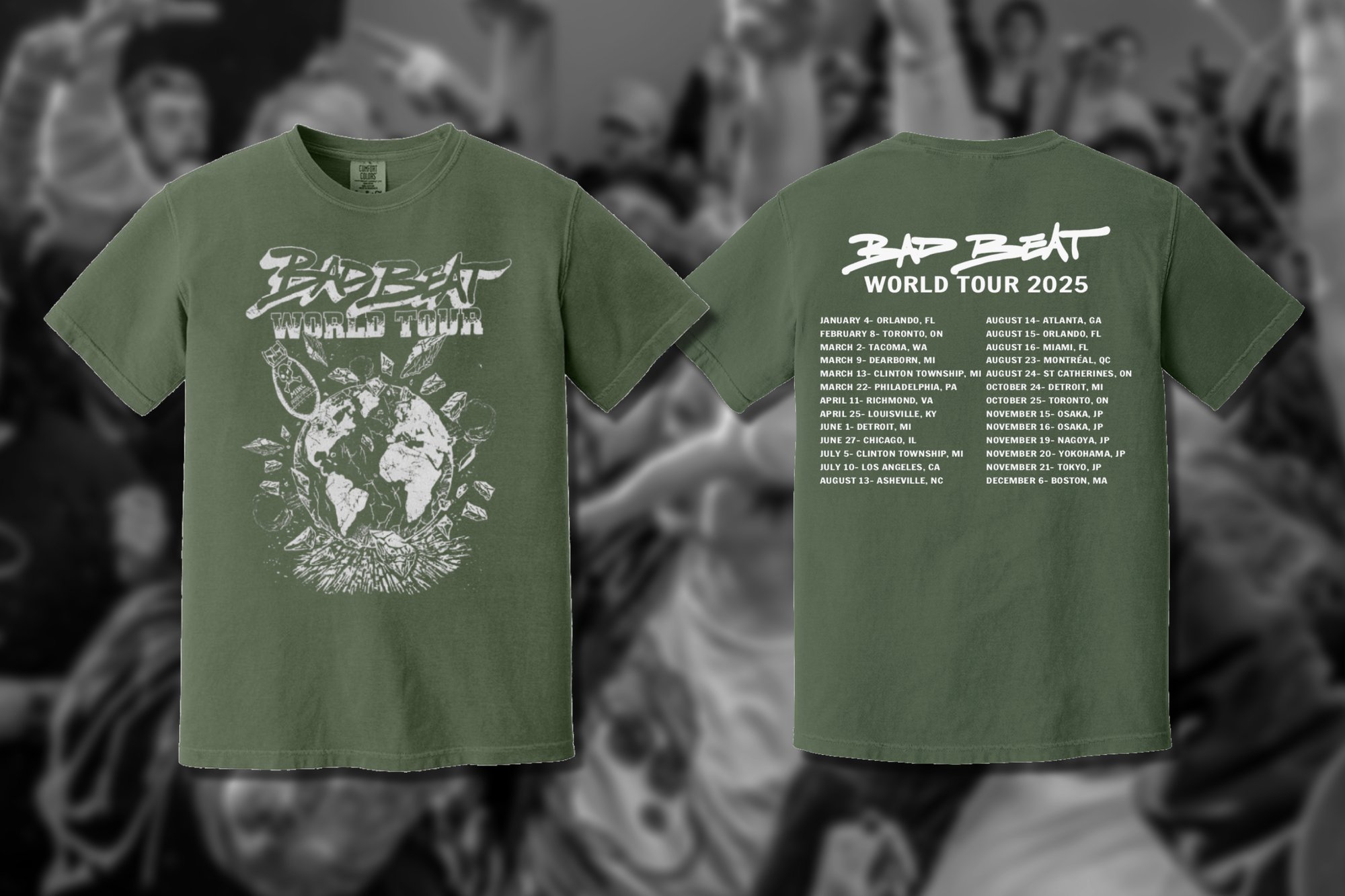 Bad Beat World Tour tee ft every date played in 2025 on back Army green Comfort Colors tee